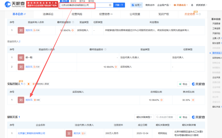 天眼查显示,北京光和谦成科技有限责任公司实控人为刘汉元,持股比例为10.9843%,表决权比例为30.35%。刘汉元为通威集团实控人,现任通威集团董事局主席。