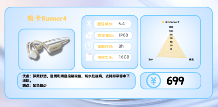总的来说,南卡Runner 4在性价比、佩戴稳固、防水音质兼顾方面表现突出,是预算有限但想要高品质运动体验用户的优选。