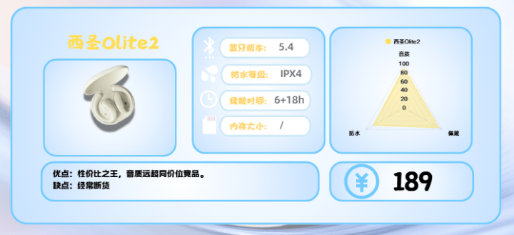 总的来说,西圣Olite2以惊人的价格、优异的音质和稳定连接性能,成为想尝试开放式耳机的入门用户理想选择,兼顾性能与性价比。